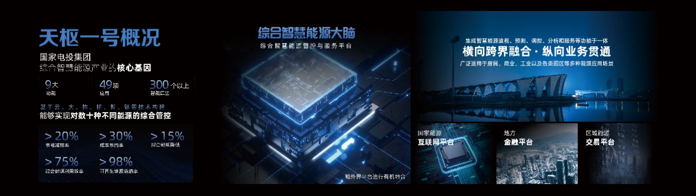“天樞一號”綜合智慧能源管控與服務(wù)平臺,是集團(tuán)公司綜合智慧能源產(chǎn)業(yè)的核心基因,是集團(tuán)公司綠色發(fā)展品牌形象的重要載體,集成智慧能源監(jiān)視、預(yù)測、調(diào)控、分析和服務(wù)等功能于一體,廣泛適用于居民、商業(yè)、工業(yè)以及各類園區(qū)等多種能源應(yīng)用場景�!疤鞓幸惶枴辈捎谩皺M向跨界融合、縱向業(yè)務(wù)貫通”的系統(tǒng)集成理念,對智慧城鎮(zhèn)、集群樓宇、產(chǎn)業(yè)園區(qū)和能源基地等多個類別的能源系統(tǒng)進(jìn)行集成,滿足支撐數(shù)據(jù)共享、安全通信、互聯(lián)互通、場景聯(lián)動、靈活參與,實現(xiàn)業(yè)務(wù)融合和少人值守,為綜合智慧能源多區(qū)域、多場景的管理提供統(tǒng)一的解決方案。可幫助能源公司由能源供應(yīng)商向綜合能源服務(wù)商轉(zhuǎn)變,實現(xiàn)一站式綜合服務(wù),給用戶提供電、熱、冷、氣、水等多種能源及相應(yīng)配套運(yùn)維服務(wù)。還可以和國家能源互聯(lián)網(wǎng)平臺、區(qū)域能源交易平臺、地方金融平臺等外界平臺進(jìn)行有機(jī)融合,實現(xiàn)全國跨服務(wù)區(qū)域的資源調(diào)配,確保項目運(yùn)營過程資源、資金安全,并為區(qū)域后續(xù)項目預(yù)留接口,實現(xiàn)一平臺全方位服務(wù)。