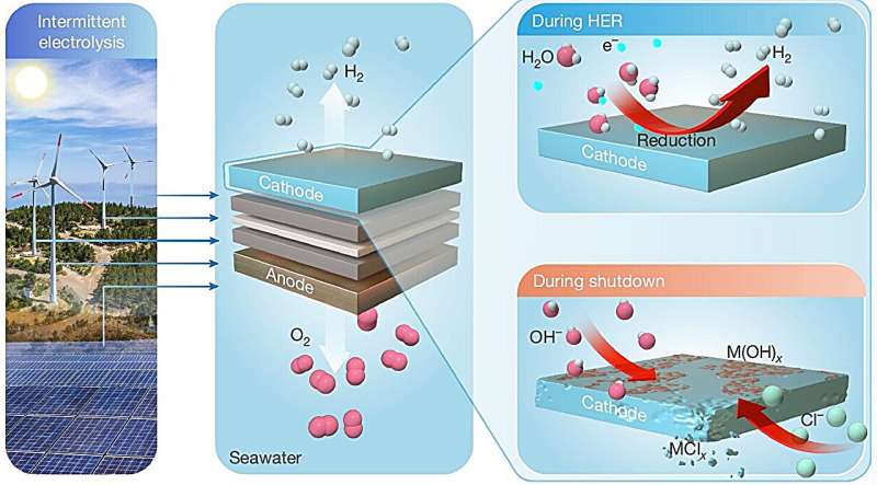 材料科學(xué)與工程系劉斌教授解釋,研究主要解決間歇性堿性(海)水電解過程中的氧化和性能損失問題,如反向電流、自氧化、自放電或氧氣交叉等,通過在電極上使用特殊保護(hù)層實(shí)現(xiàn)。