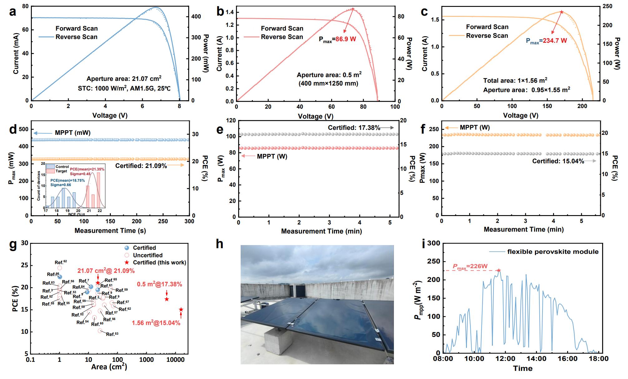 基于此策略,研究團(tuán)隊(duì)實(shí)現(xiàn)柔性電池24.52%轉(zhuǎn)換效率,10000次彎折后仍保持92.5%初始效率。團(tuán)隊(duì)還制備了大面積柔性組件,0.5m2組件輸出功率86.9W,1.4725m2組件輸出功率226W,單位質(zhì)量功率達(dá)558W˙kg-1。此前柔性組件最大尺寸在100cm2級(jí)別,而此次柔性組件首次突破了平米級(jí)制造的難題,并開(kāi)始戶(hù)外部署,為走向應(yīng)用邁出了關(guān)鍵一步。