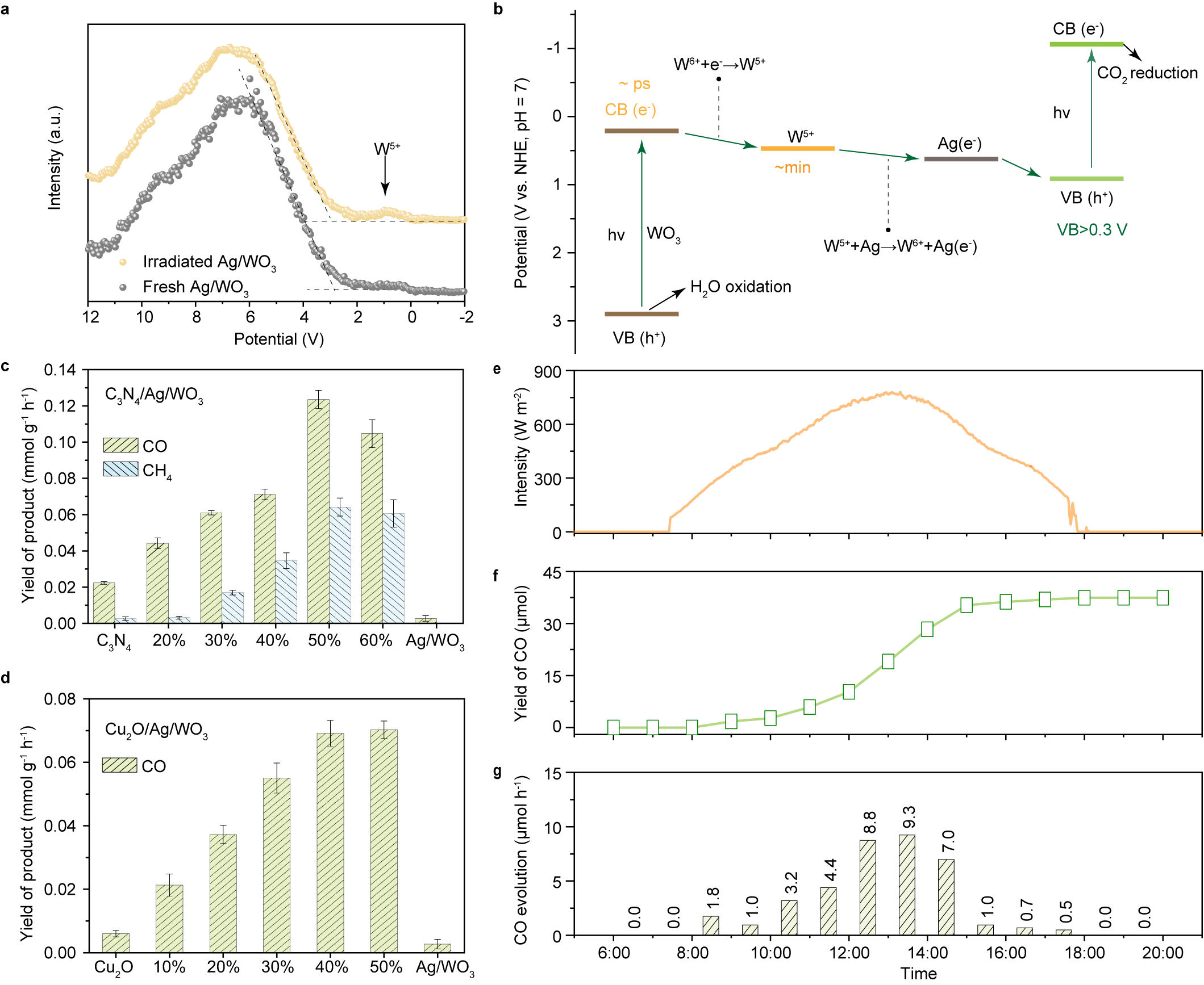 我國科研團(tuán)隊(duì)這項(xiàng)新方案模擬植物暫存光生電子的生理機(jī)制,創(chuàng)新性地設(shè)計(jì)出一種電子存儲(chǔ)路徑,通過定向設(shè)計(jì)、制備材料結(jié)構(gòu),使其能夠在光照時(shí)儲(chǔ)存電子,并在需要時(shí)精準(zhǔn)釋放,從而實(shí)現(xiàn)對二氧化碳與水反應(yīng)速率和程度的精確調(diào)控。基于這一思路,研究團(tuán)隊(duì)成功構(gòu)建出具有電子存儲(chǔ)功能的銀修飾三氧化鎢(Ag/WO3)材料。通過將其與催化活性組分酞菁鈷復(fù)合進(jìn)行驗(yàn)證,測得二氧化碳轉(zhuǎn)化效率較純酞菁鈷提升了近百倍。此外,這一策略具備良好的通用性與適用性,可根據(jù)實(shí)際需求構(gòu)建多種結(jié)構(gòu)適配的復(fù)合催化劑體系。該方案在自然光條件下運(yùn)行穩(wěn)定,為利用太陽能規(guī)�;D(zhuǎn)化二氧化碳、生產(chǎn)一氧化碳、甲烷等清潔能源提供了可行的技術(shù)路徑。