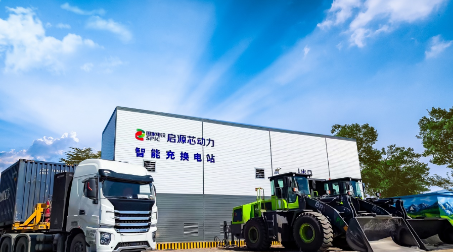 ▲國家電投“獨角獸”成長企業(yè)啟源芯動力研發(fā)生產(chǎn)的換電工程車輛及充換電站